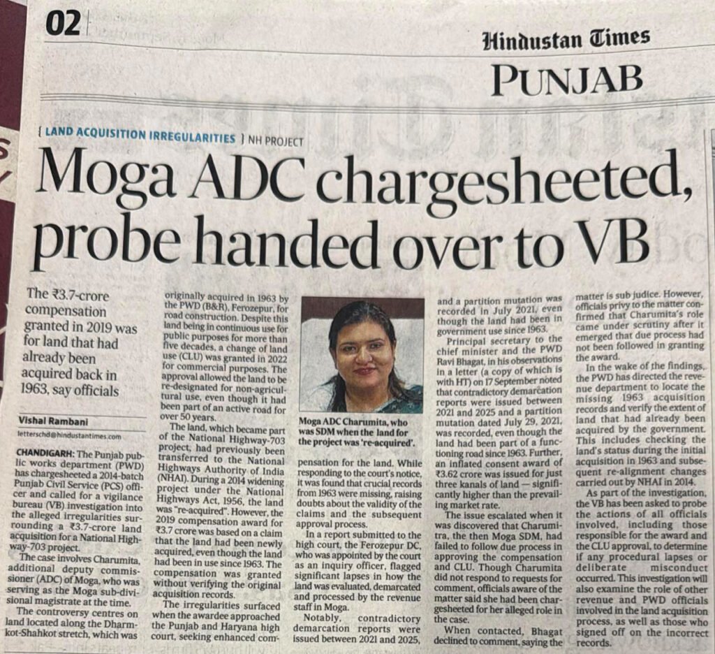 राष्ट्रीय राजमार्ग 703 प्रोजेक्ट में हुई कथित धांधलियों के सन्दर्भ में एक अंग्रेजी अखबार ने मुख्यमंत्री के प्रिंसिपल सचिव रवि भगत के एक पत्र का हवाला देते हुए 22 सितंबर को खबर प्रकाशित की थी कि पंजाब पब्लिक वर्क्स विभाग (पीडब्ल्यूडी) द्वारा 2014 बैच की पीसीएस अधिकारी चारुमिता जो कि इस वक्त मोगा की एडीसी हैं, को चार्जशीट किया है। इसके साथ ही PWD ने इस मामले की जांच विजिलेंस ब्यूरो द्वारा करवाने की मांग भी है। इस खबर के प्रकाशन के बाद से जहां आईएएस व PCS लॉबी में चर्चाओं का बाजार गरम था वहीं समूचे पंजाब में ये खबर चर्चा का विषय बनी हुई थी। जिसके बाद 25 सितंबर को एडीसी चारुमिता ने एक पत्रकार वार्ता कर मीडिया कर्मियों के समक्ष अपना पक्ष रखा।