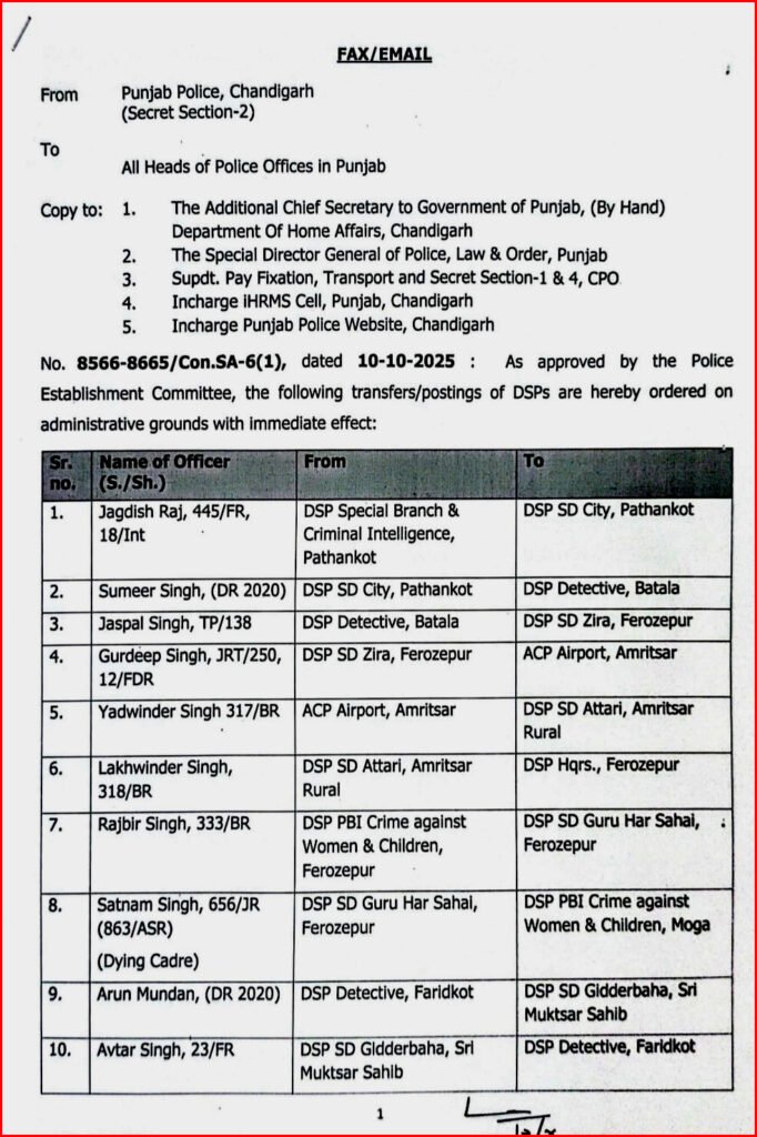 पंजाब के डायरेक्टर जनरल ऑफ़ पुलिस ने अपनी शक्तियों का प्रयोग करते हुए 10 अक्टूबर को एक पत्र जारी कर राज्य के कुल 53 डीएसपी रैंक के अधिकारियों के तबादलों का आदेश जारी किया है।