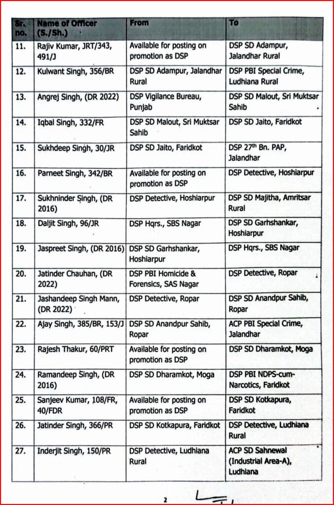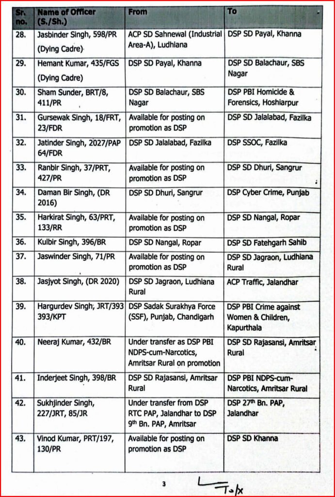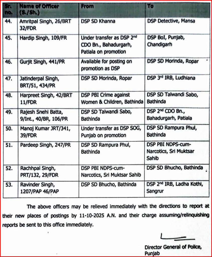 DG पंजाब की ओर से राज्य के जिला पुलिस प्रमुख को भेजे गए पत्र के अनुसार, 53 DSP के तबादलों की सूची इस प्रकार है :