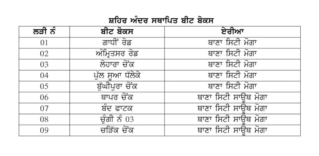 पुलिस कर्मचारियों की भलाई व जनता के साथ उनकी नजदीकी बढ़ाने के मकसद से एसएसपी मोगा आईपीएस अधिकारी अजय गांधी की ओर से एक अनोखी पहल की गई है। जिसके तहत मोगा के अंदर कुल 9 बीट बॉक्स स्थापित किए गए हैं। आइए पहले आप ये जान लें कि यह बीट बॉक्स कहां-कहां स्थापित किए गए हैं :