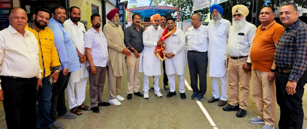 प्रधान समीर जैन को सिरोपा पहनाते आढ़ती प्रभजीत सिंह काला व अन्य।
