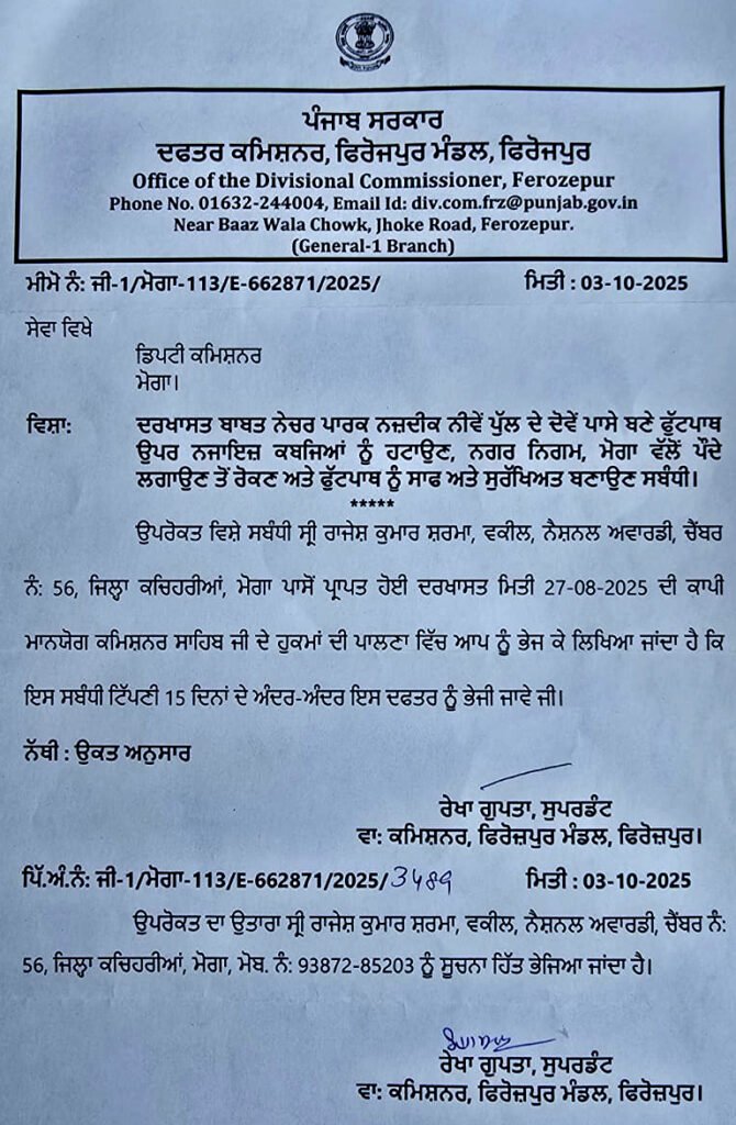 डिविजनल कार्यालय फिरोजपुर की ओर से डीसी मोगा को जारी किए गए पत्र की कॉपी।