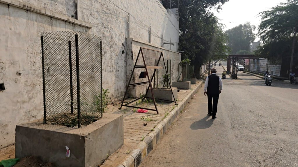 नगर निगम की और से फुटपाथ को तोड़कर किये गए पौधारोपण की तस्वीरें।